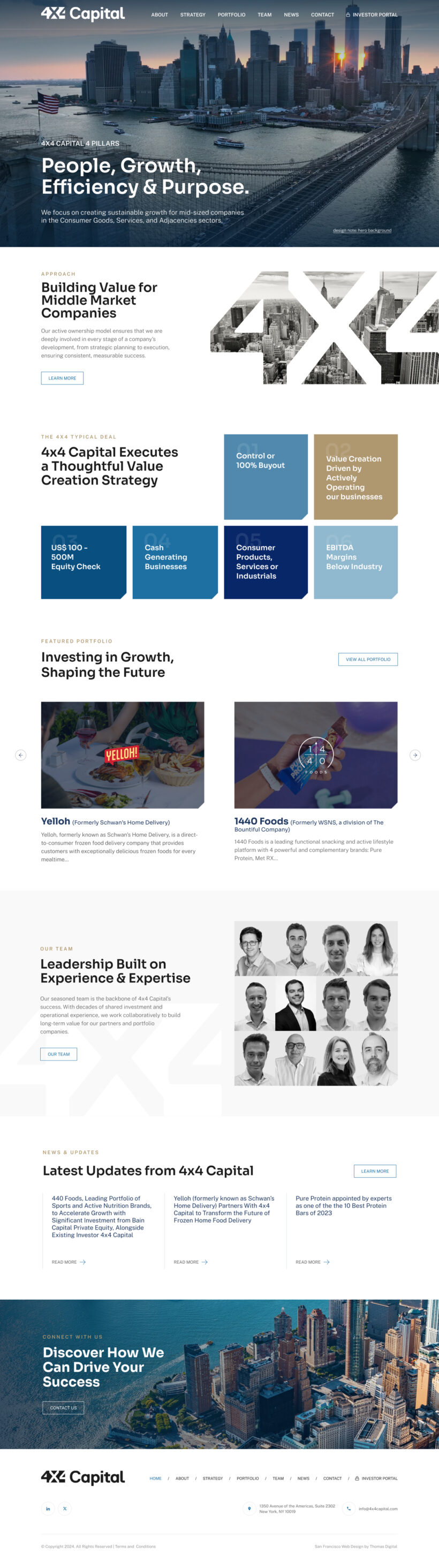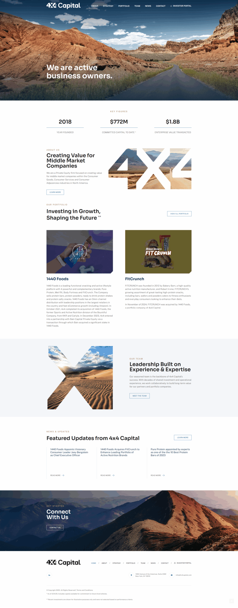 The goal of the website redesign was to provide a clear and engaging overview of 4×4 Capital’s investment approach, portfolio, and vision. The site serves as an informational platform, giving visitors insight into the firm’s track record and capabilities in executing future deals.