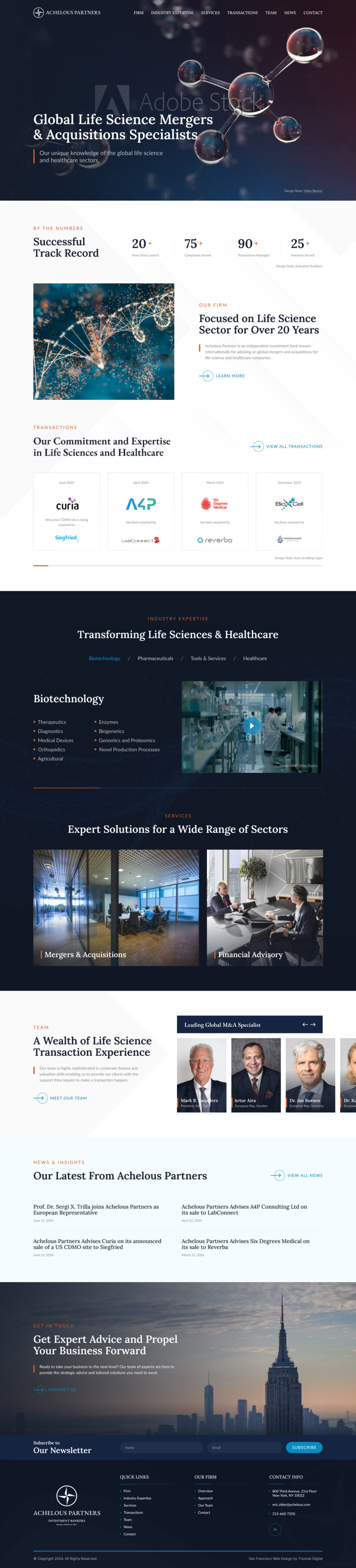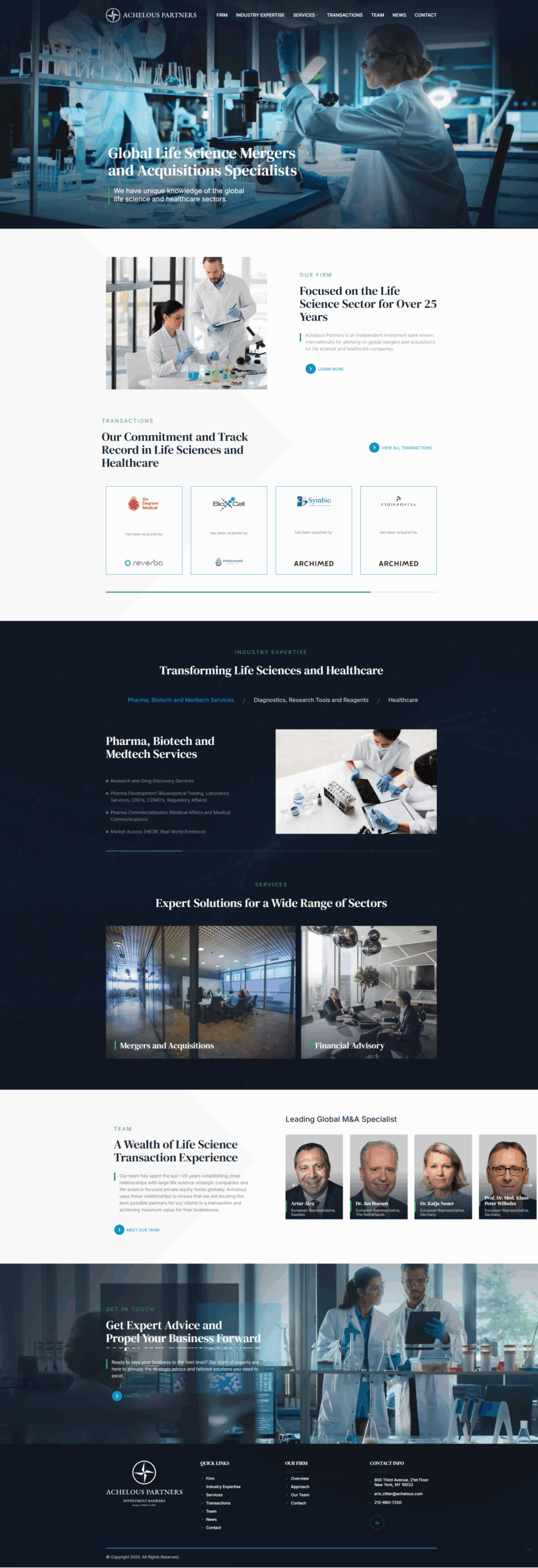 Achelous Partners was seeking a modern, professional website refresh that would reflect its global presence and specialized focus. From the visitor’s perspective, the site functions as a streamlined online business card—free of forms, e-commerce features, or user interaction elements. Instead, the priority was to present information clearly and concisely, with a focus on credibility and ease of navigation. The design needed to align with the firm’s reputation and offer a strong, visual introduction to its capabilities in the healthcare M&A space.