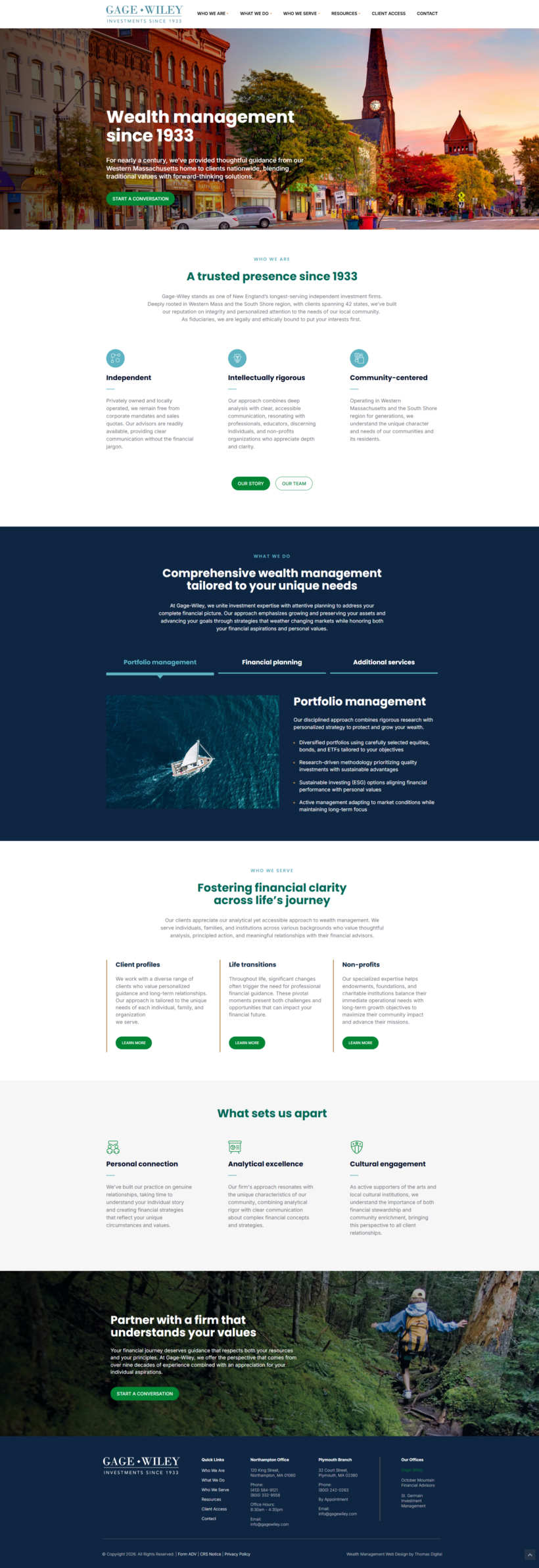 The purpose of the website launch was to articulate Gage-Wiley’s identity, philosophy, and services in a clear and approachable way. Visitors needed to quickly understand what the firm does, who it serves, and how its independent, client-first approach differs—while reinforcing confidence in the firm’s experience, analytical depth, and long-standing relationships.