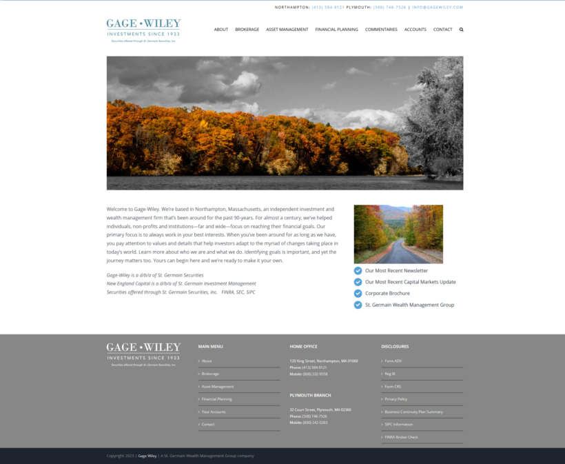 Gage-Wiley is one of New England’s longest-serving independent investment firms, providing wealth management services since 1933. Deeply rooted in Western Massachusetts and the South Shore region, the firm serves individuals, families, and institutions nationwide with fiduciary guidance grounded in integrity, intellectual rigor, and community connection.