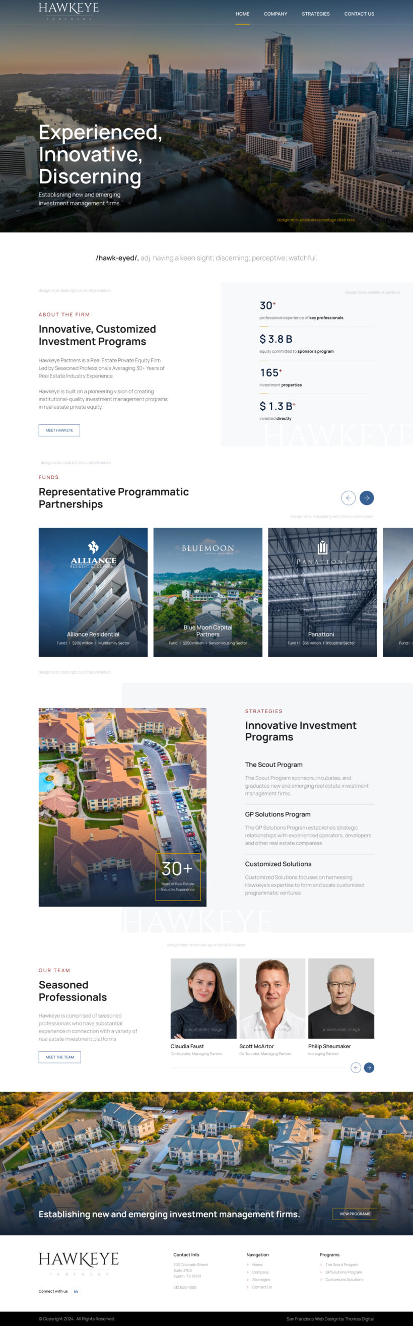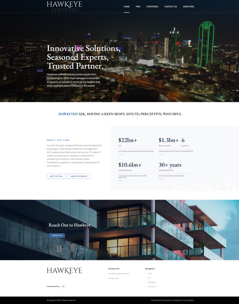 Thomas Digital developed a custom website that places Hawkeye’s investment platform and team at the center of the presentation. The layout emphasizes clarity, professionalism, and trust, while offering intuitive navigation for prospective partners and investors. Key features include a mobile-responsive design, improved program overviews, enhanced team profiles, and a custom WordPress build tailored to Hawkeye’s long-term digital needs.