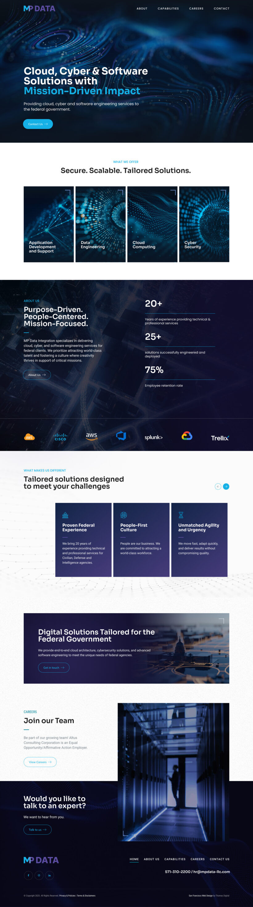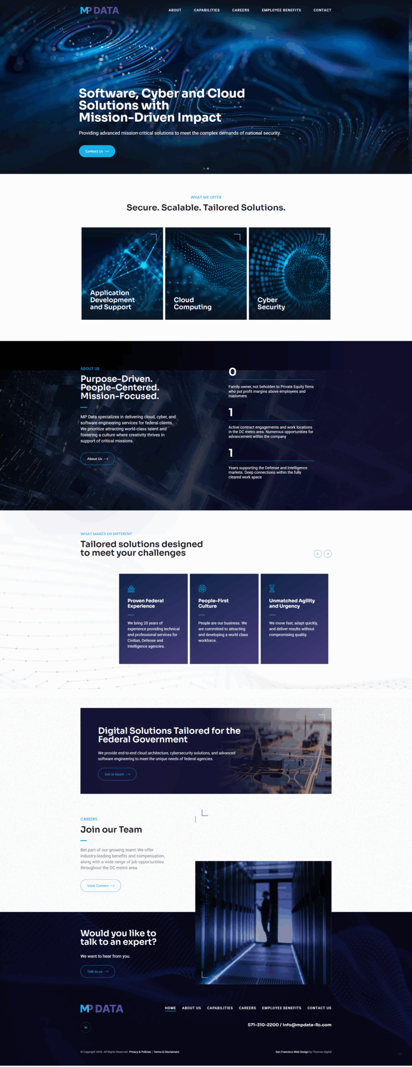 Built on a custom WordPress platform and optimized for mobile responsiveness, the website also reflects MP Data’s people-first culture, highlighting their commitment to attracting top-tier talent, offering industry-leading benefits, and fostering creativity in service of their clients’ missions.