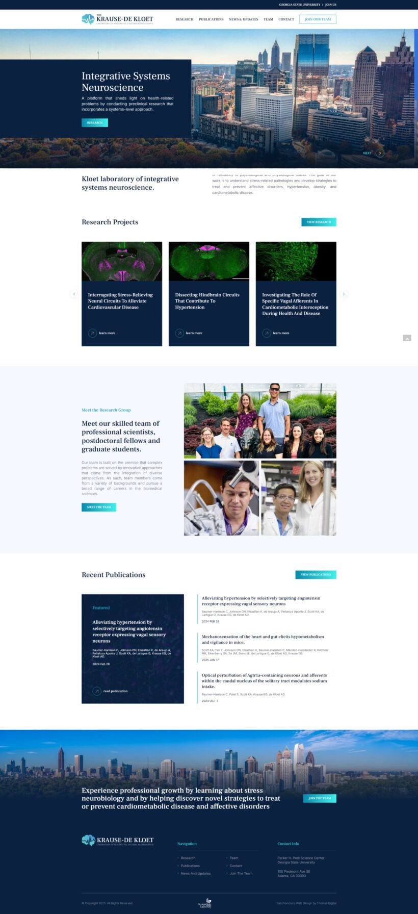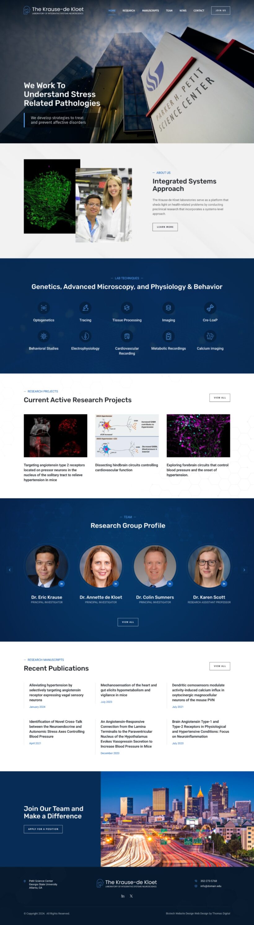 The Krause-de Kloet Laboratory’s website design emphasizes clarity and professionalism utilizing a clean layout with a cohesive color scheme that reflects the scientific nature of their work. High-quality images and graphics are strategically placed to complement the content enhancing visual engagement without overwhelming the user.